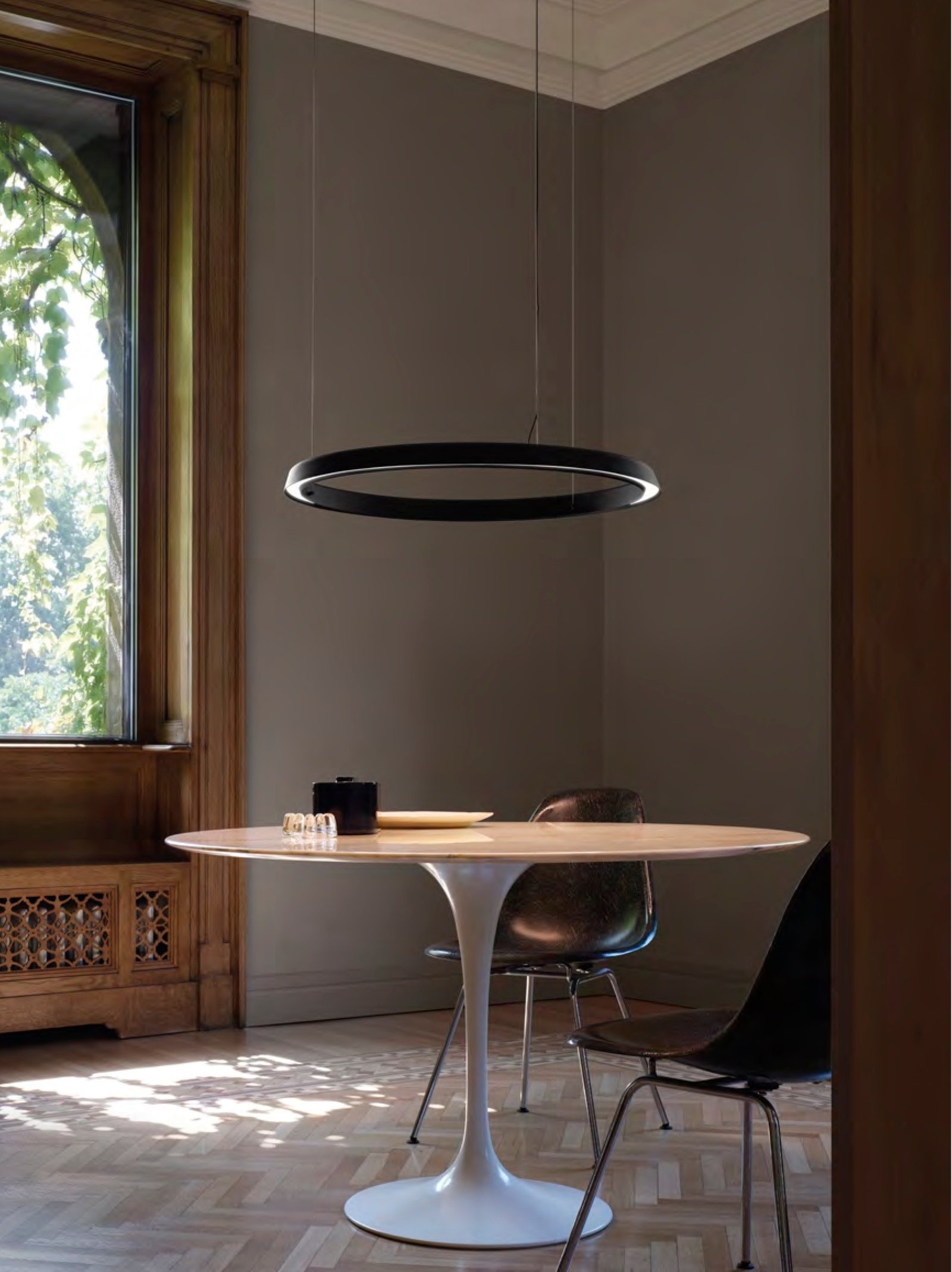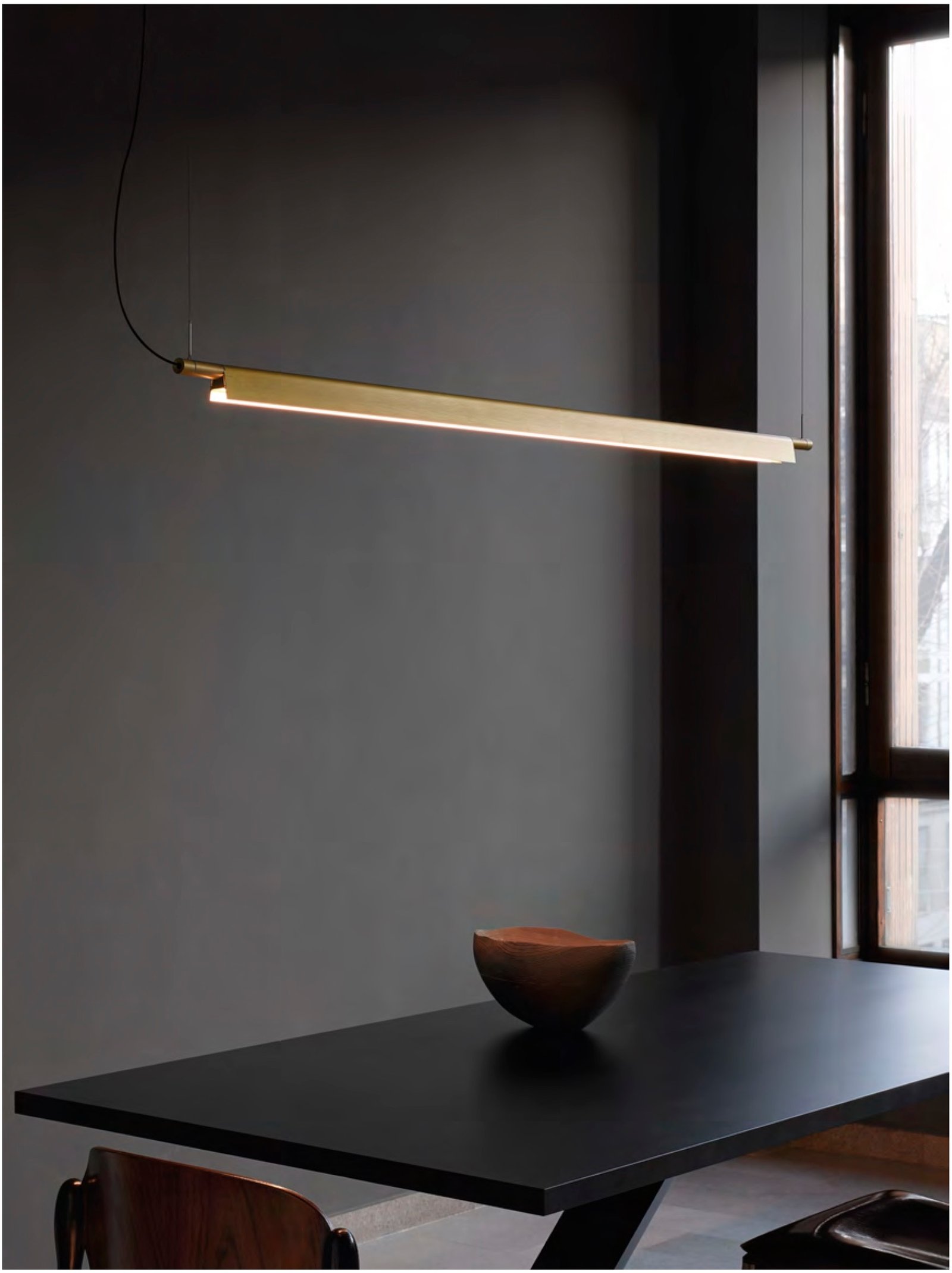La lámpara colgante Compendium es una lámpara esencial y elegante que difunde una gran cantidad de luz sobre las superficies. Es versátil, ya que permite una iluminación directa hacia abajo o indirecta hacia arriba, que se ajusta girando el reflector en el momento de la instalación. La lámpara se puede utilizar con un regulador de intensidad de pared.