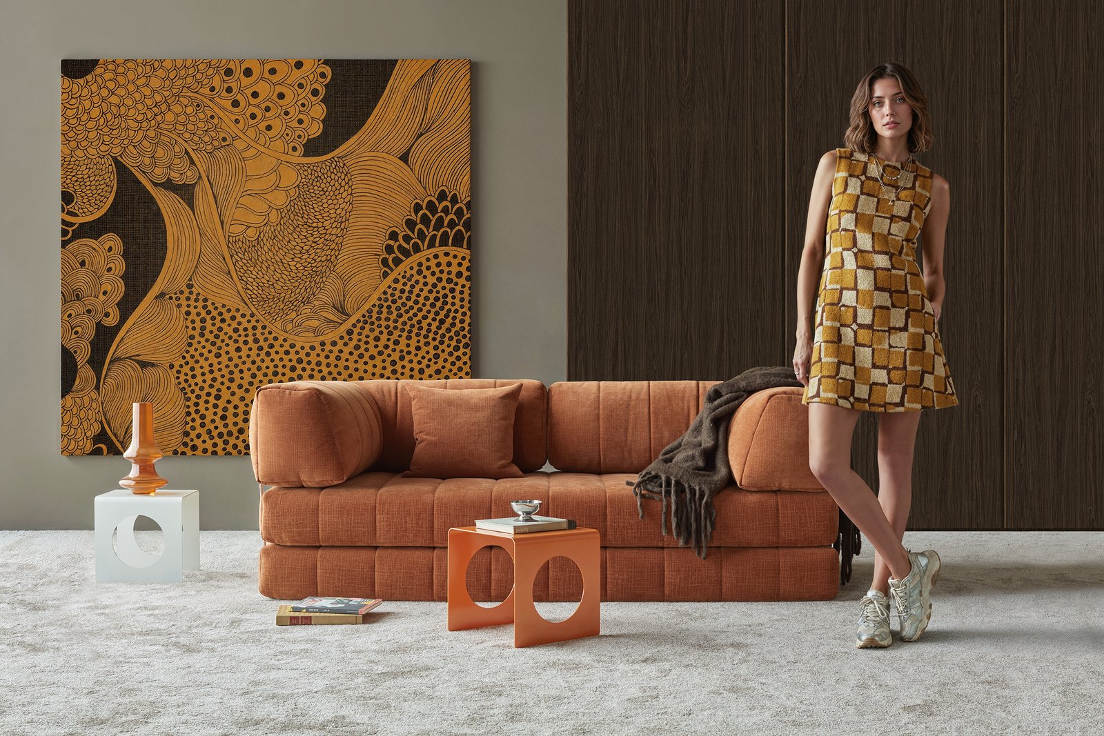 Los reposabrazos tapizados, enmarcados por una barra metálica con acabado cromado que sirve de soporte. Inspirado en la visión de Flemming Højfeldt de la década de 1970.