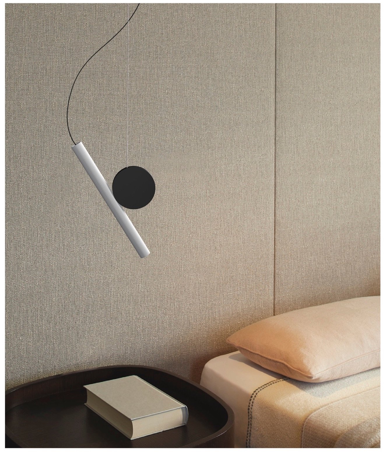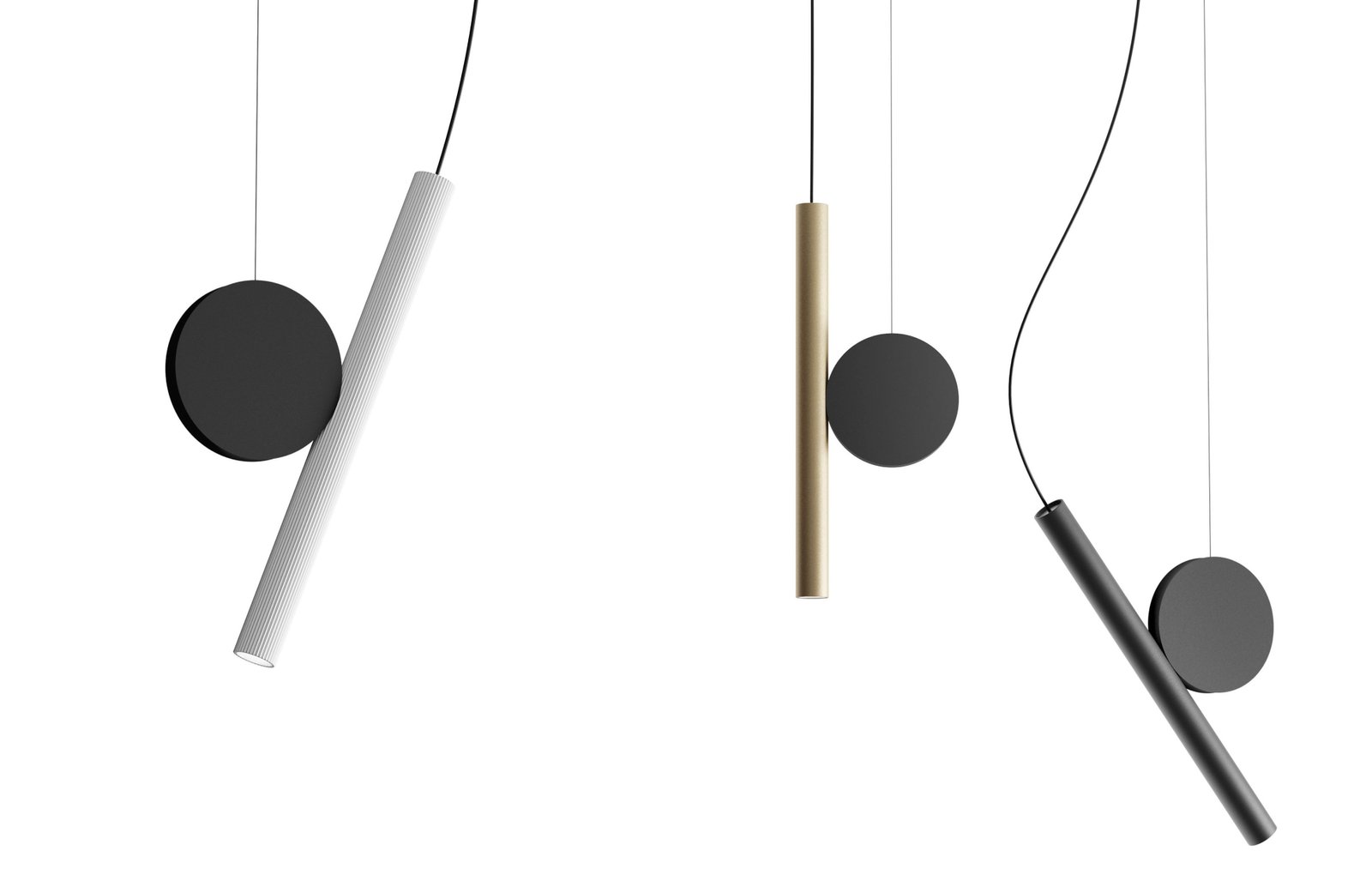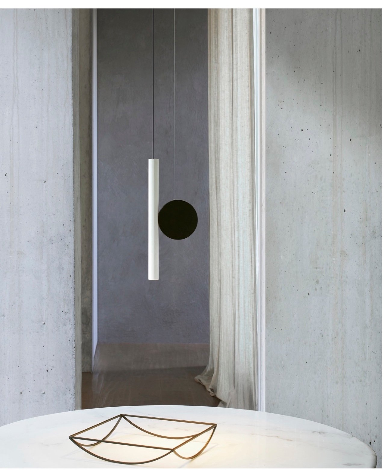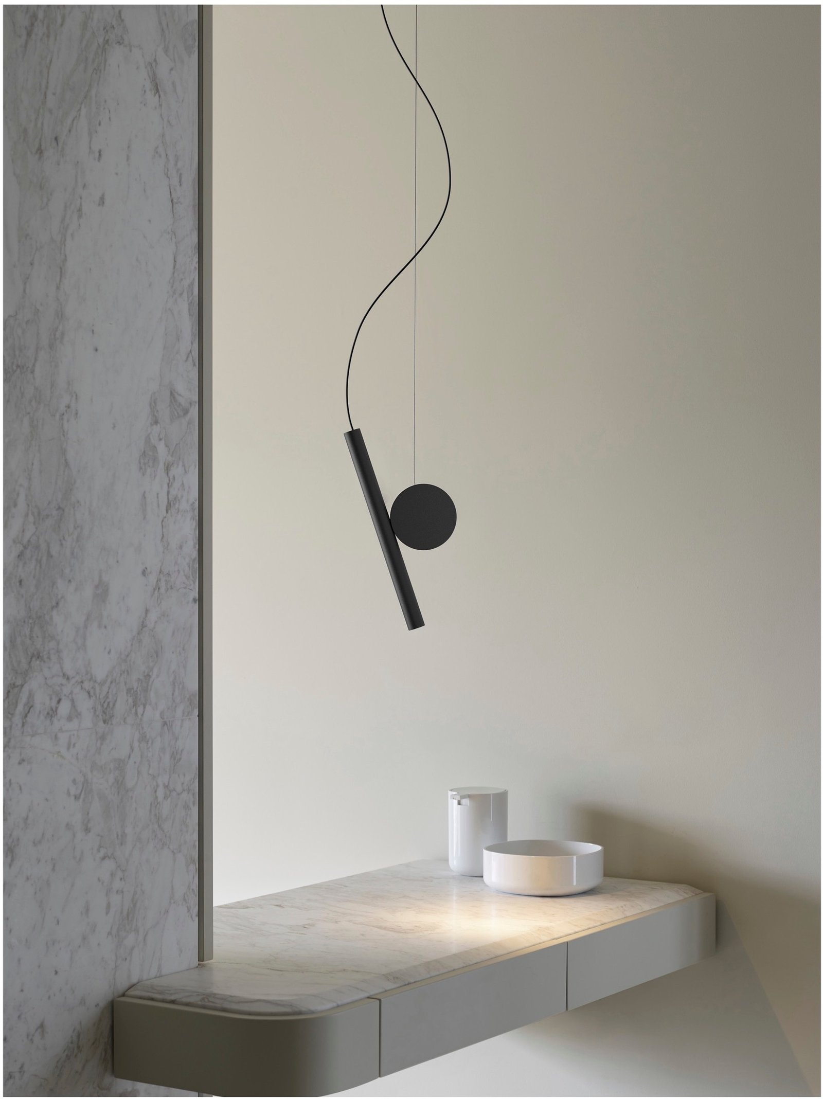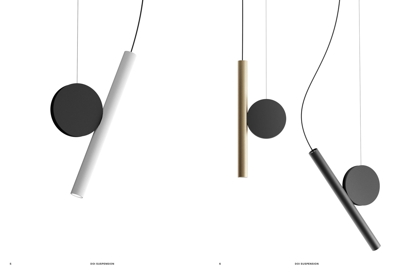 La tipología requiere que una o más piezas se suspendan del techo mediante un cable, libres para moverse y flotar en el espacio, hasta que su peso alcance la estabilidad para determinar su posición. La lámpara parece estable, pero siempre se encuentra en estado de tensión. DOI se compone de dos piezas: el disco (fijado al techo mediante un cable de acero) y el foco (de aluminio extruido, alimentado por un delgado cable eléctrico). También en versión fija de pared.