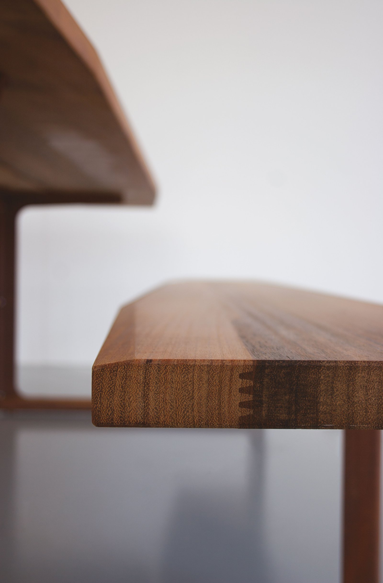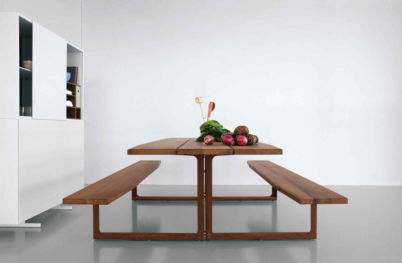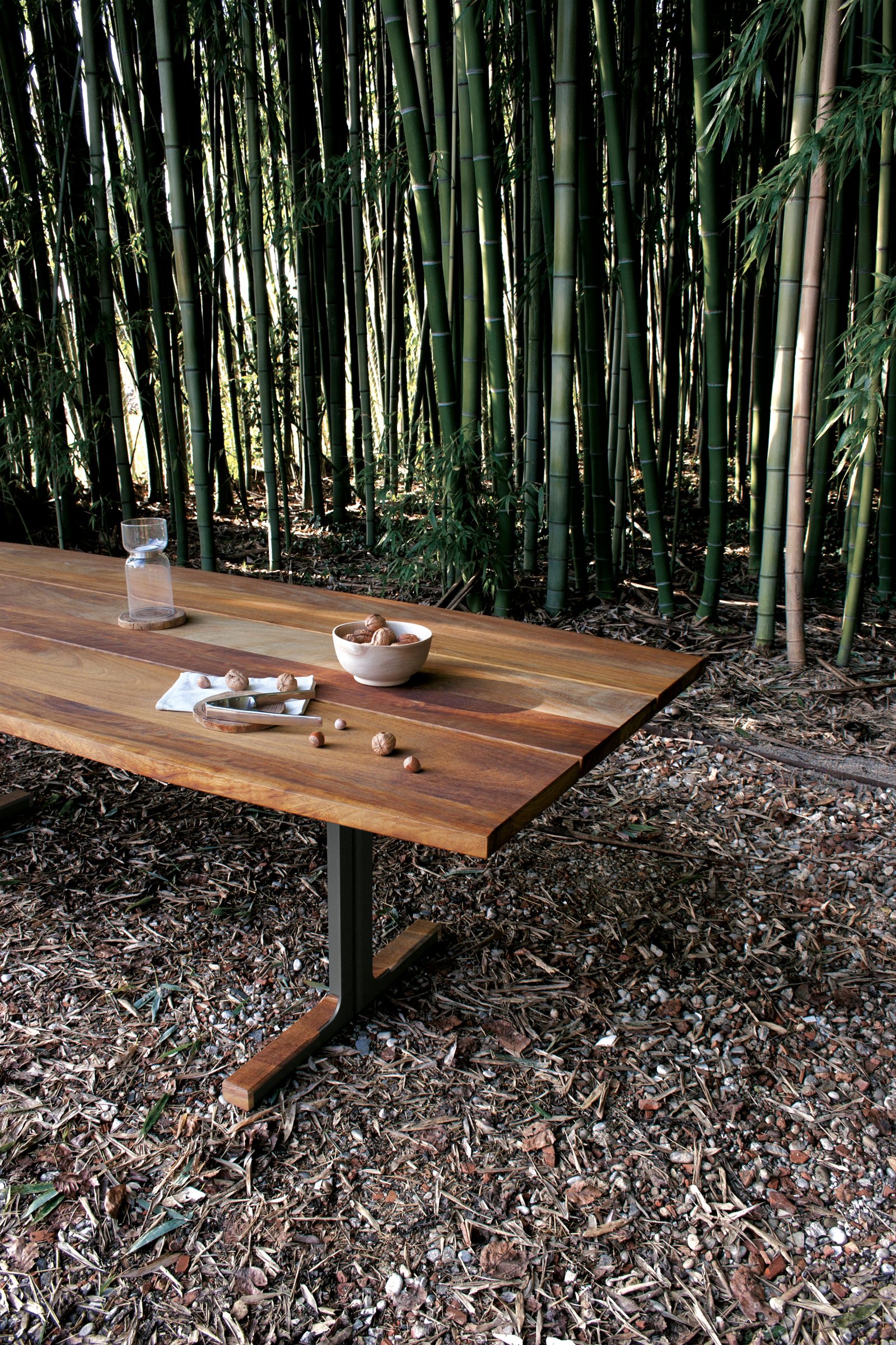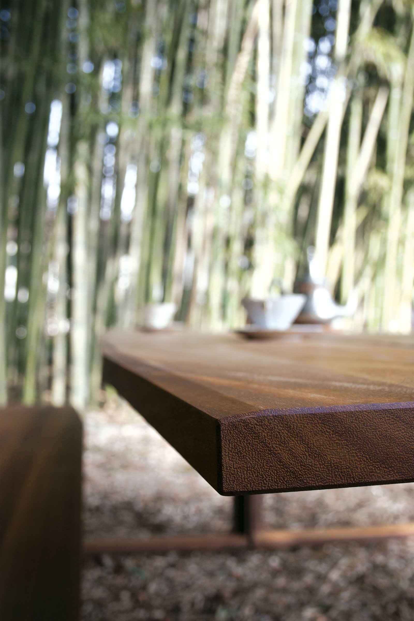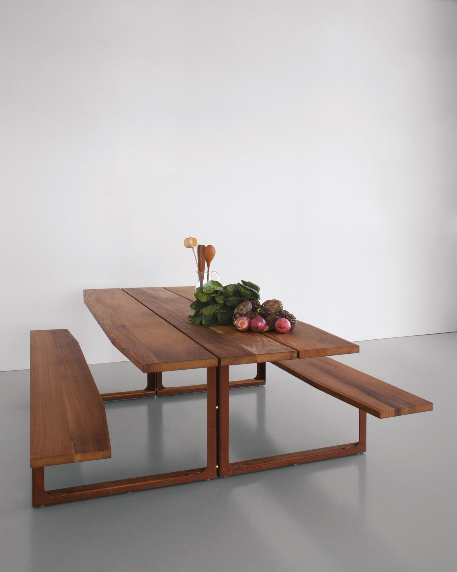 Diseñado sin concesiones para su uso en exteriores, también está disponible en acabados de nogal y roble macizo para su uso en interiores. En la versión para exteriores, la parte superior y los asientos son de iroko tratado con aceite natural, el bastidor es de acero corten o acero pintado con pintura en polvo y los elementos de conexión son de acero inoxidable y latón.