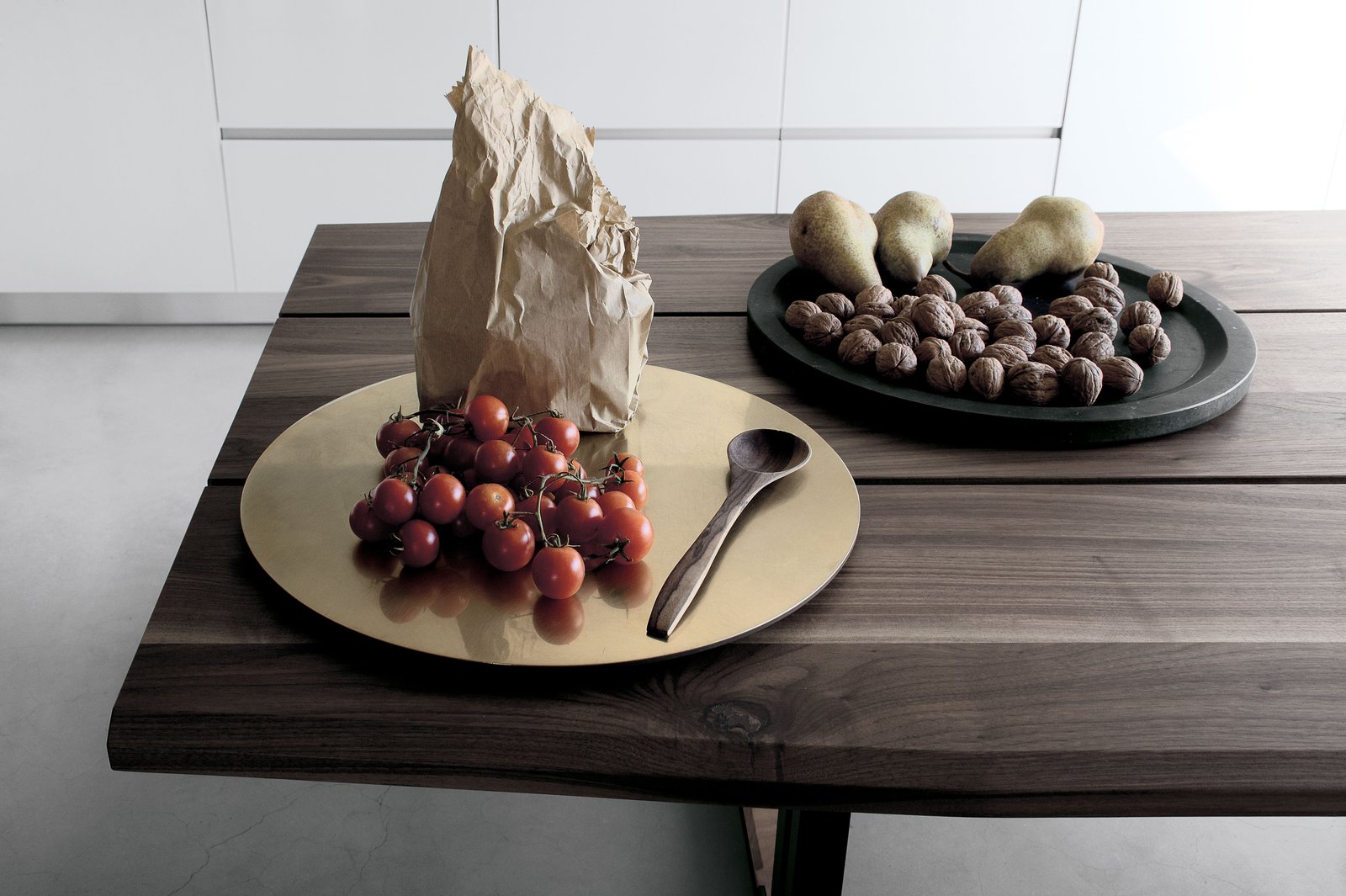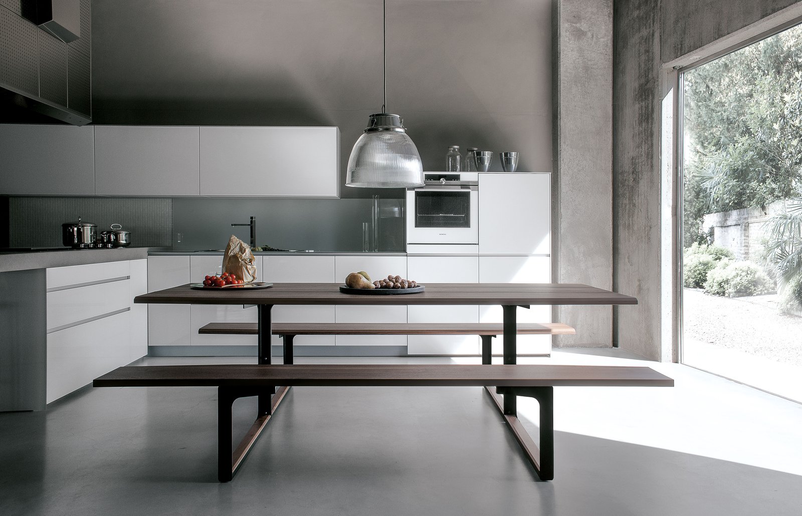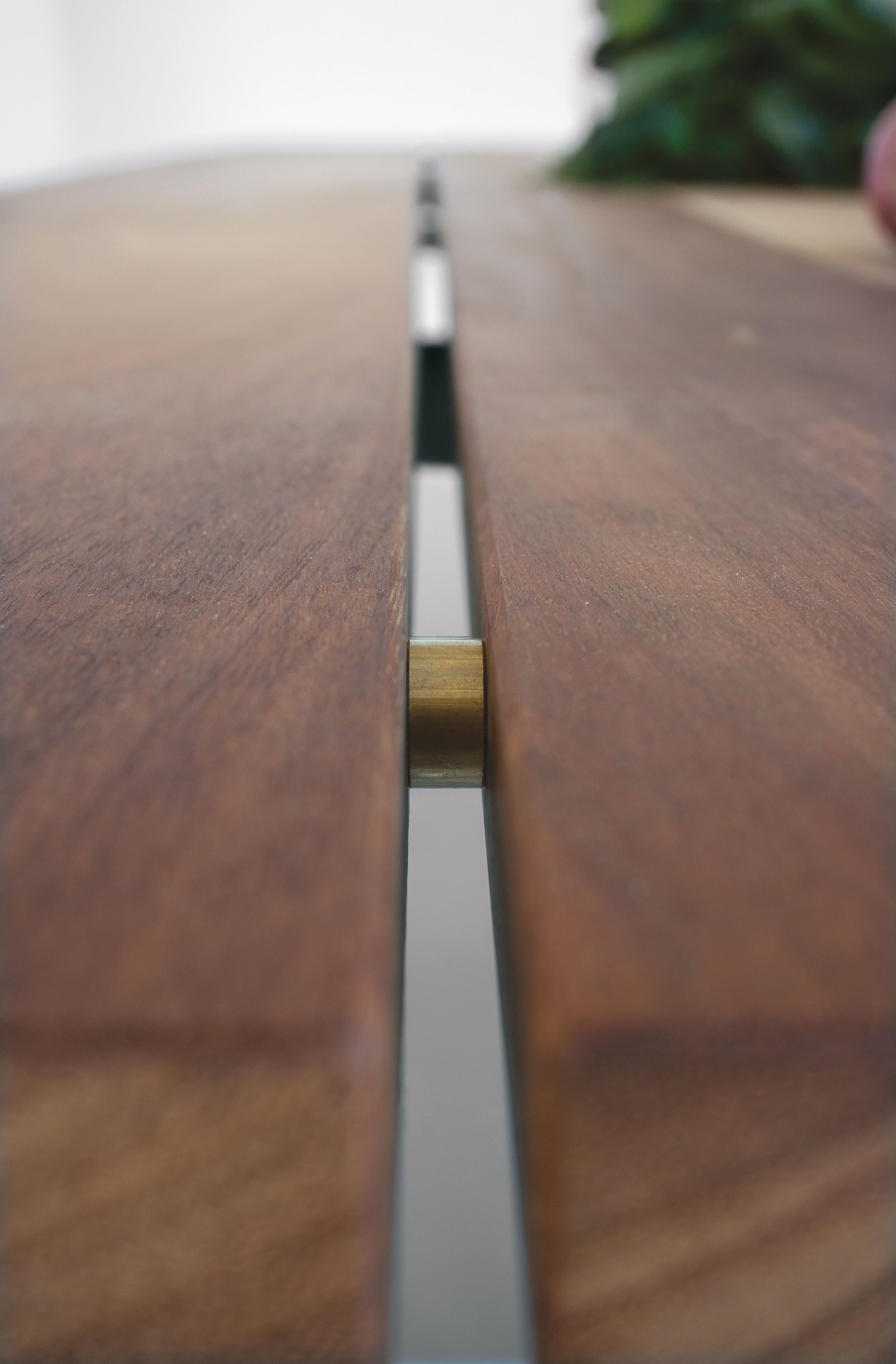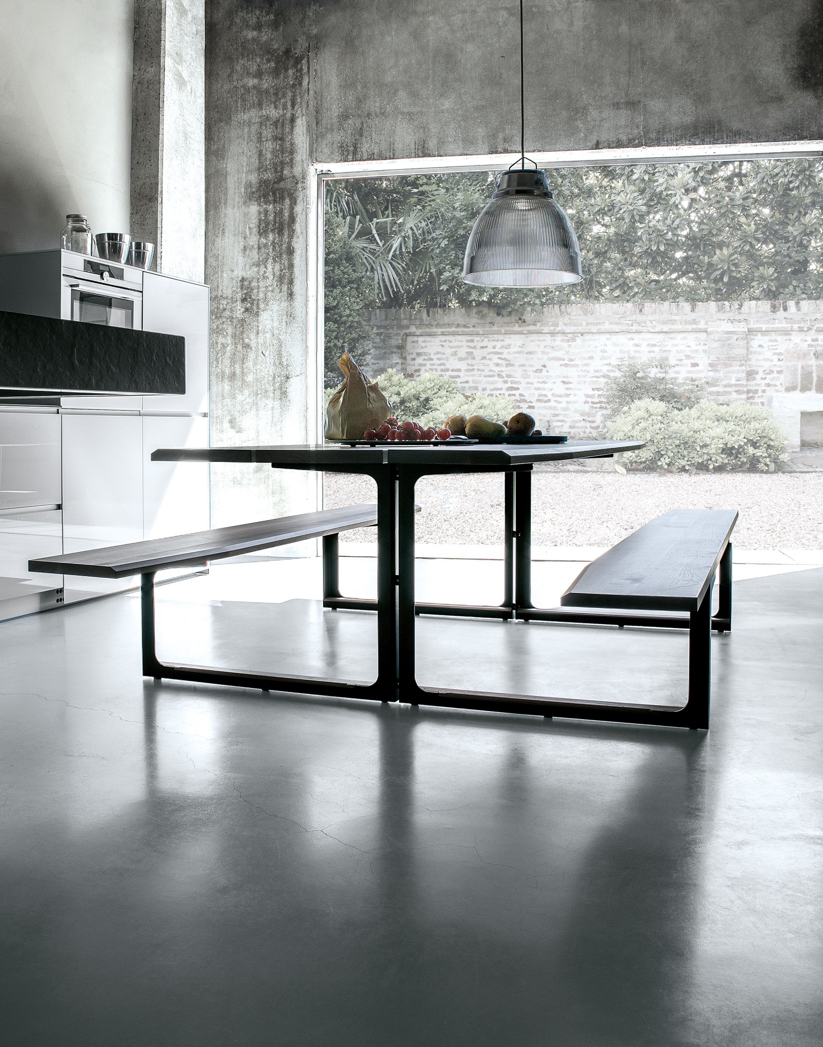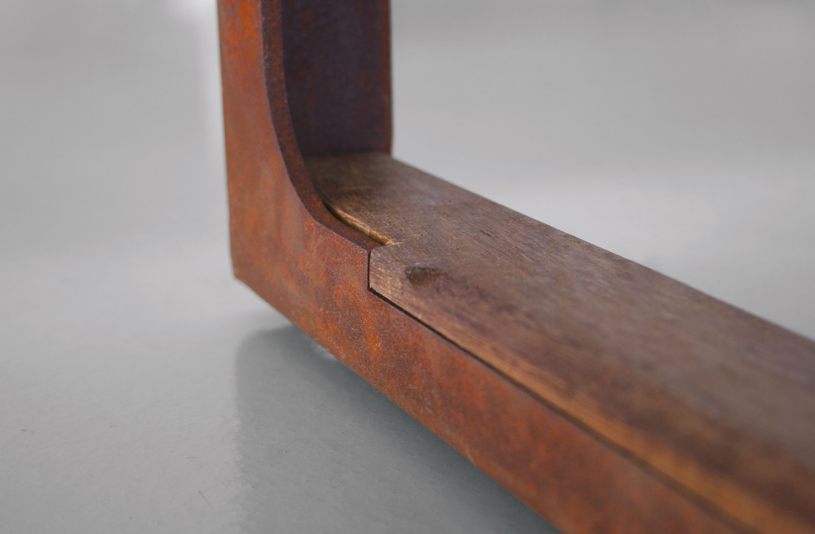 Diseñado sin concesiones para su uso en exteriores, también está disponible en acabados de nogal y roble macizo para su uso en interiores. En la versión para exteriores, la parte superior y los asientos son de iroko tratado con aceite natural, el bastidor es de acero corten o acero pintado con pintura en polvo y los elementos de conexión son de acero inoxidable y latón.