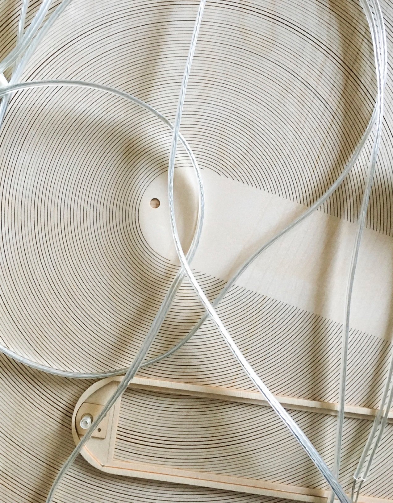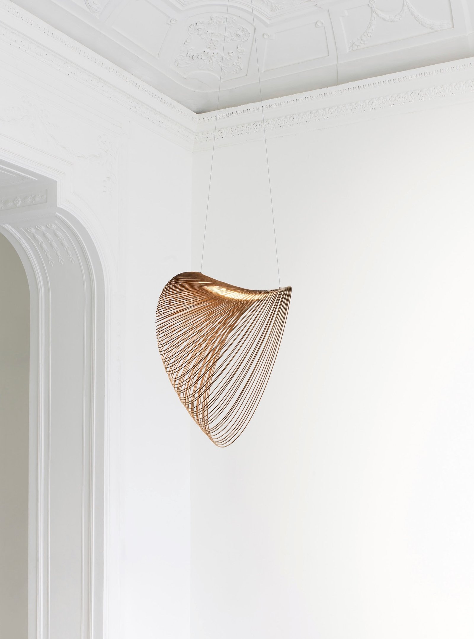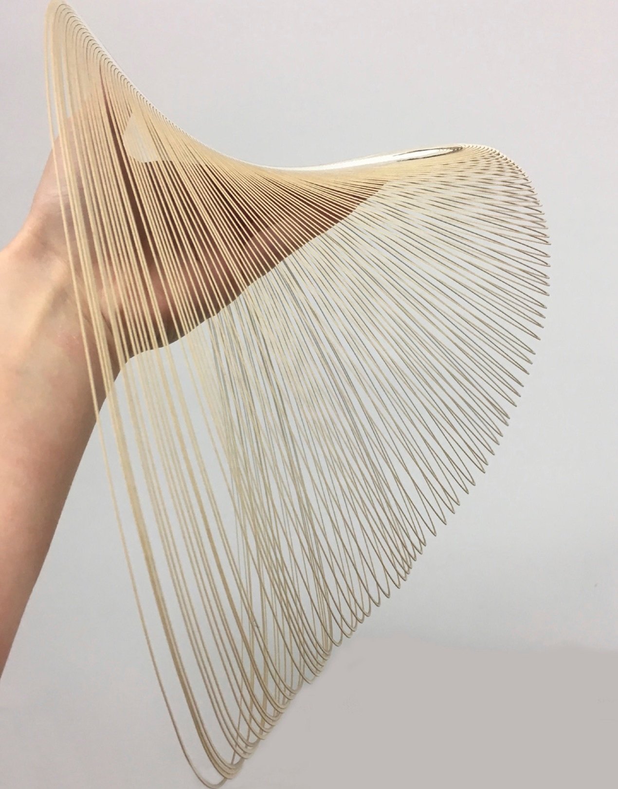 La lámpara está compuesta por un cuerpo muy ligero fabricado con madera contrachapada extremadamente fina y flexible, cortada con láser siguiendo líneas equidistantes muy densas. Se trata de un material precioso y variado cuyo carácter natural único se aprecia en el veteado típico. Adquiere volumen gracias a la fuerza de la gravedad y adopta su forma característica que flota en el aire.