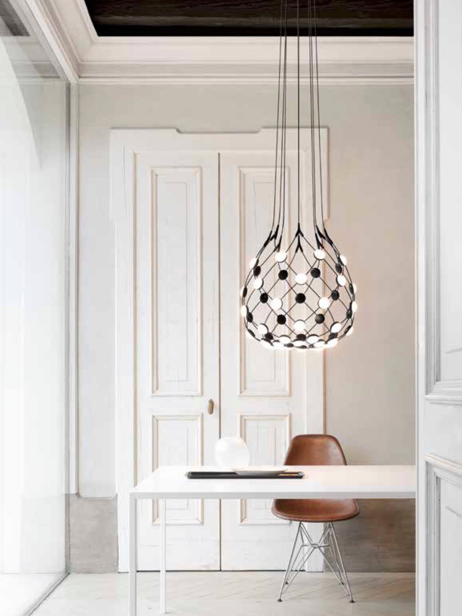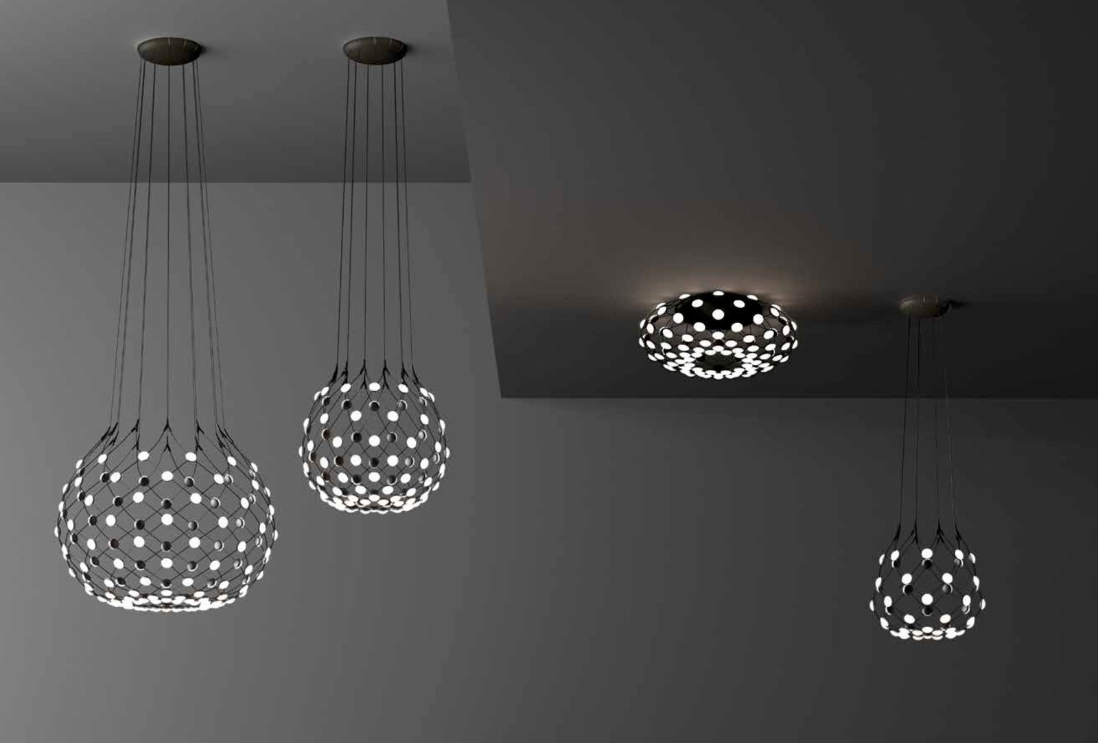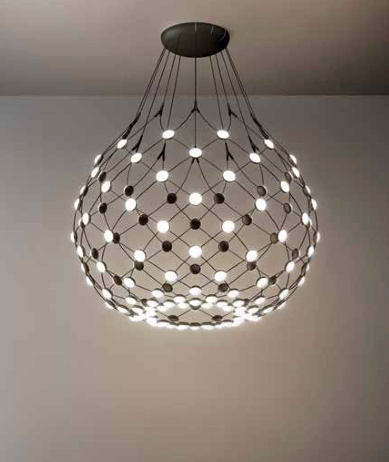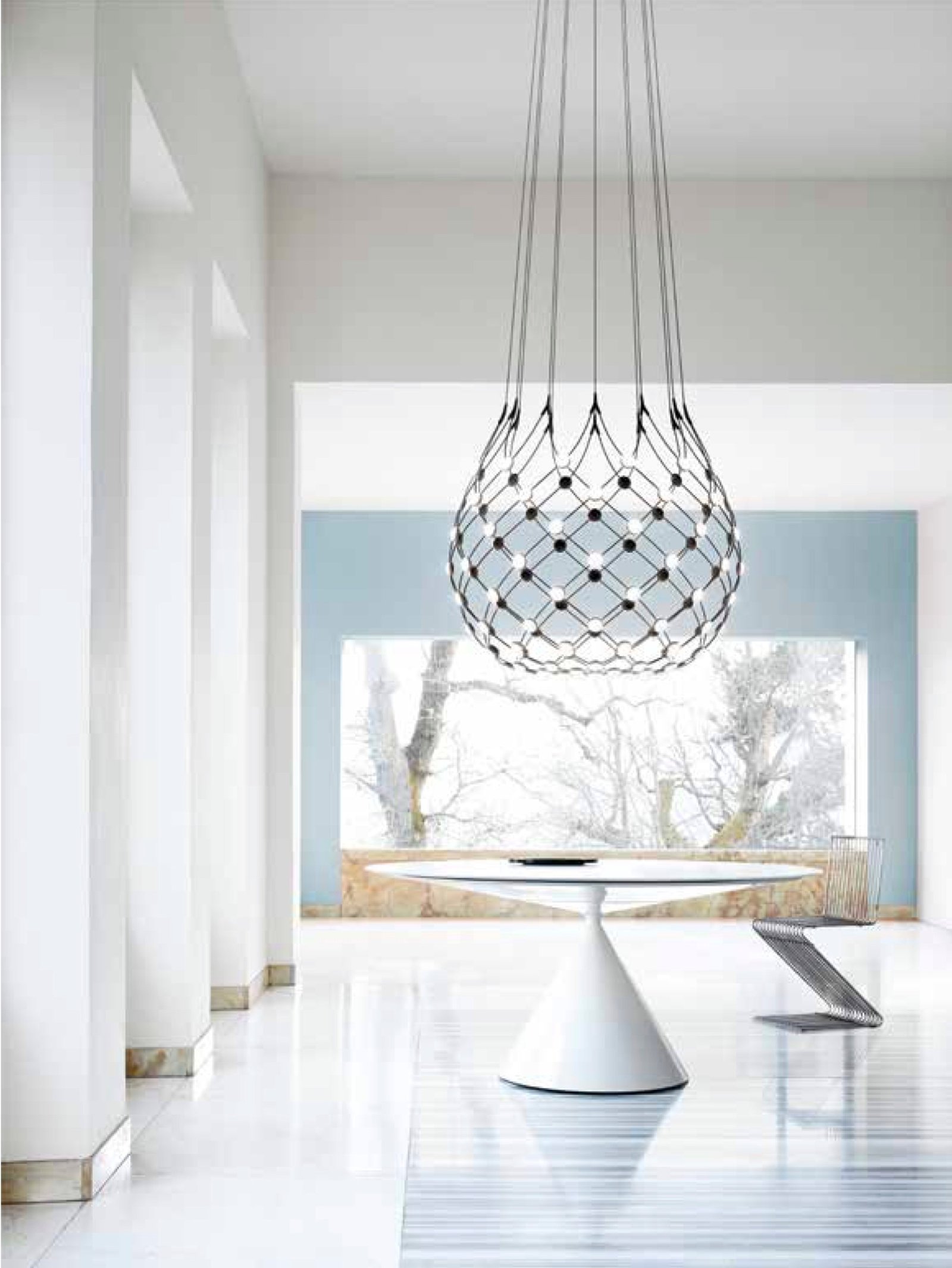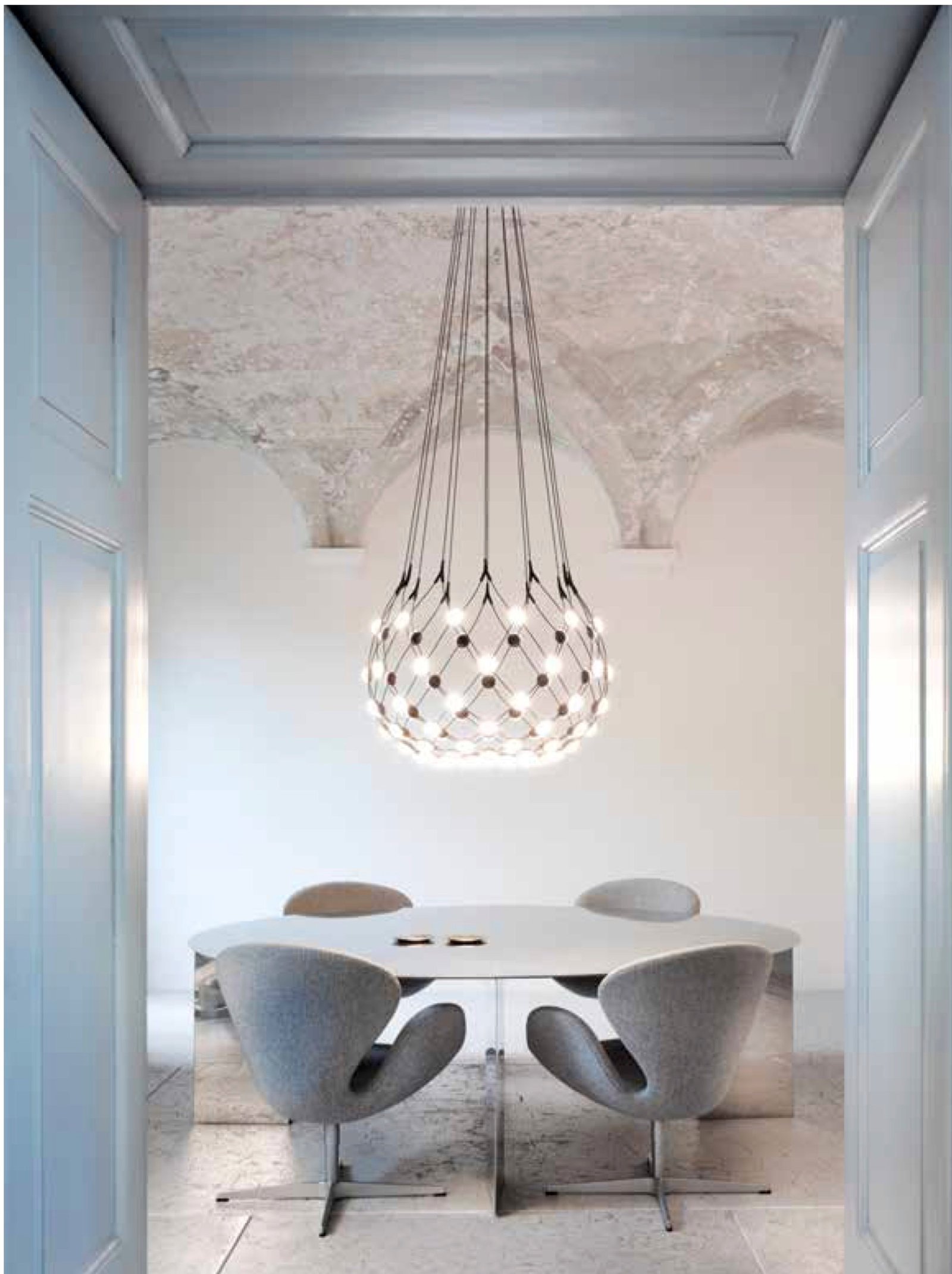 Una lámpara de gran impacto teatral cuya estructura casi transparente, compuesta por una red de cables flexibles con fuentes LED situadas en sus intersecciones, oculta la complejidad del diseño, desmaterializándolo para dejar espacio solo a la luz, la verdadera protagonista.