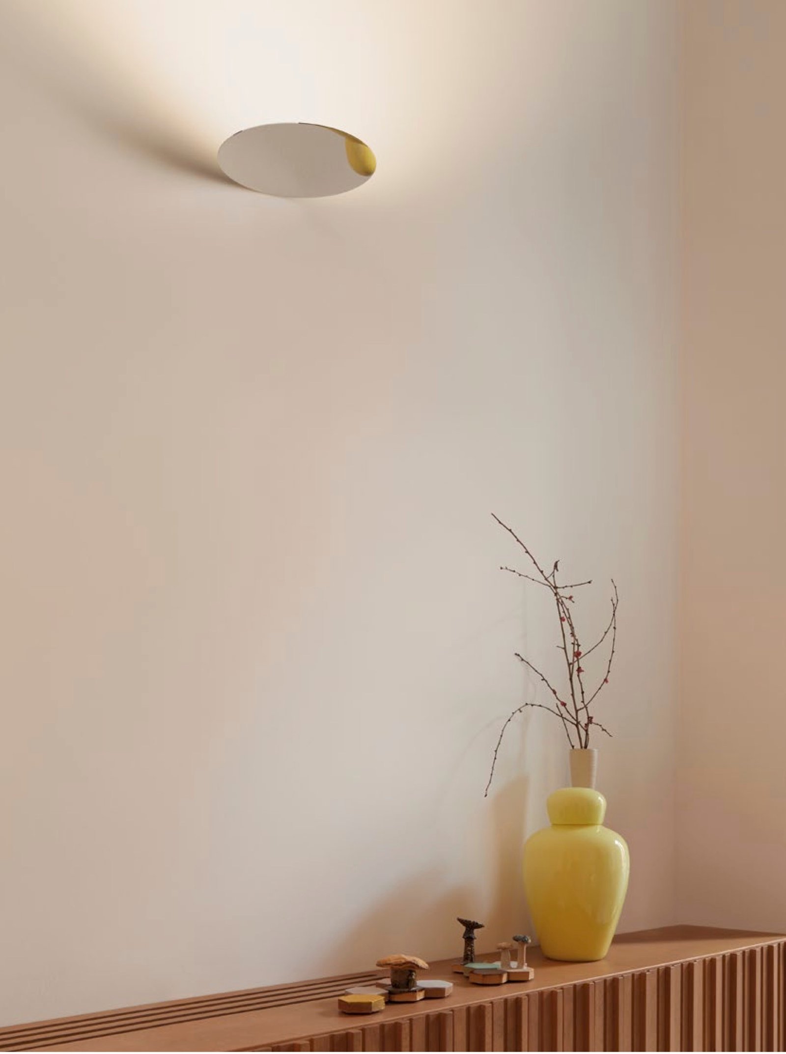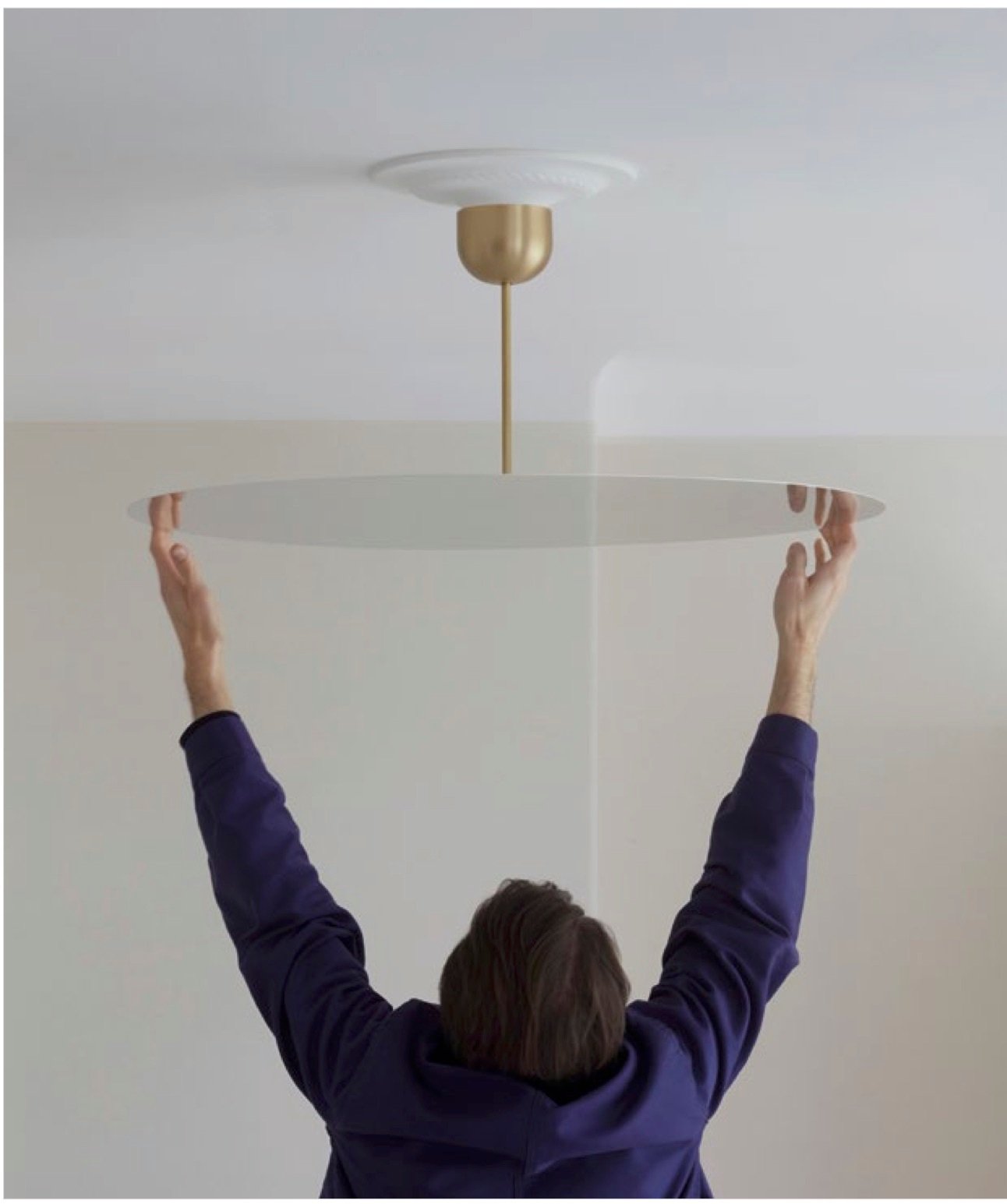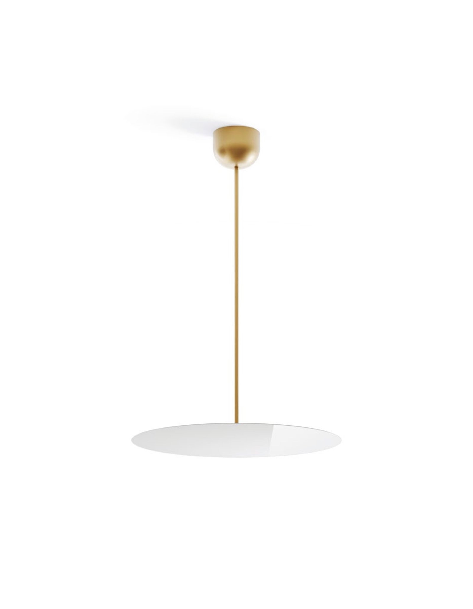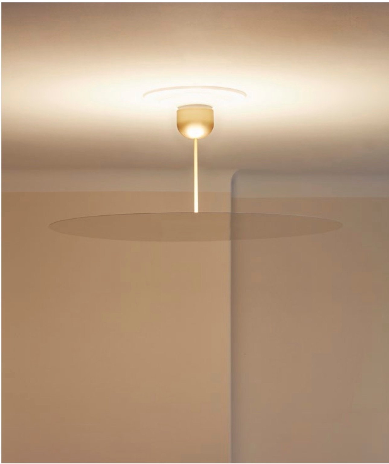A medio camino entre una lámpara colgante y una lámpara de techo, Millimetro se compone de un disco circular reflectante muy fino (1 mm de grosor) y una luz cálida y envolvente dirigida hacia arriba desde abajo. La tapa superior está unida a un vástago que sostiene el disco metálico con acabado espejo. La fuente de luz LED, oculta detrás del disco, proporciona un brillo difuso y uniforme.