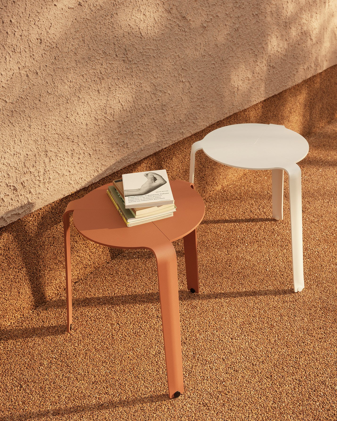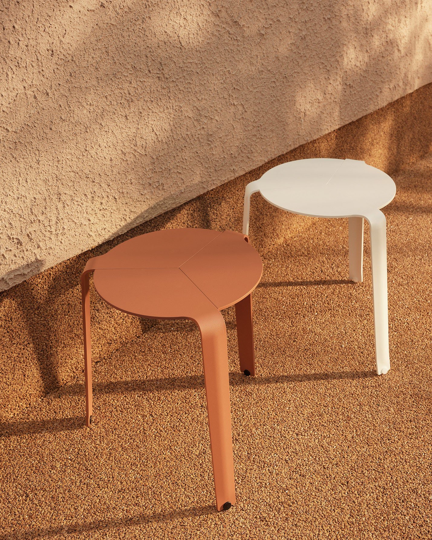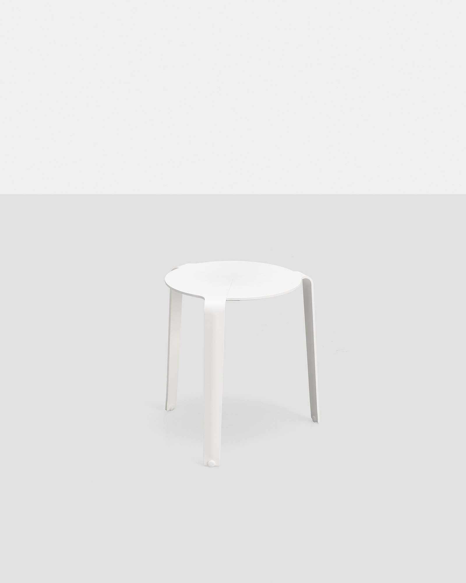 Homenaje a Alvar Aalto. Reedición de la mesa/taburete de tres patas diseñada por Luciano Bertoncini en 2012, fabricada íntegramente en aluminio y apilable hasta 10 unidades. Apta para exteriores e interiores.