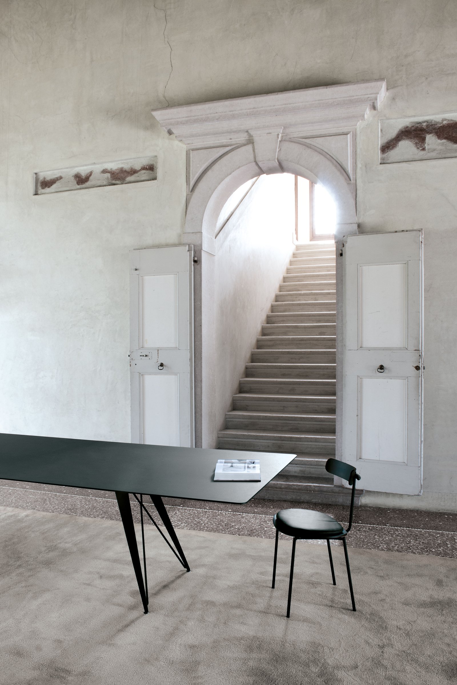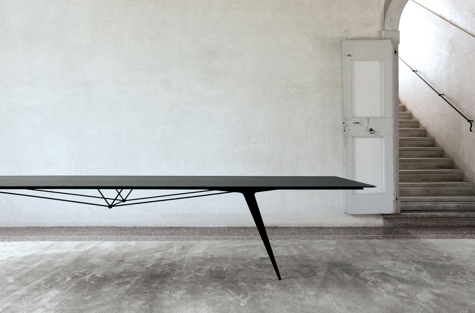 Pensar en una mesa inspirada en las estructuras de los puentes ha hecho posible la producción de tableros de 400 cm de longitud en una sola pieza. El sistema de tirantes tensables de la base hace que la estructura sea extremadamente rígida a las solicitaciones laterales y garantiza la perfecta planitud del tablero.