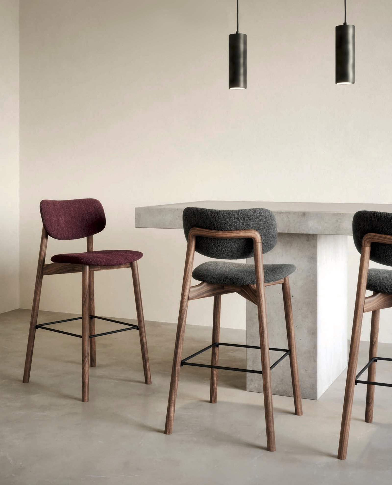 Tapizada, patas de madera, disponible también en versión taburete y silla lounge